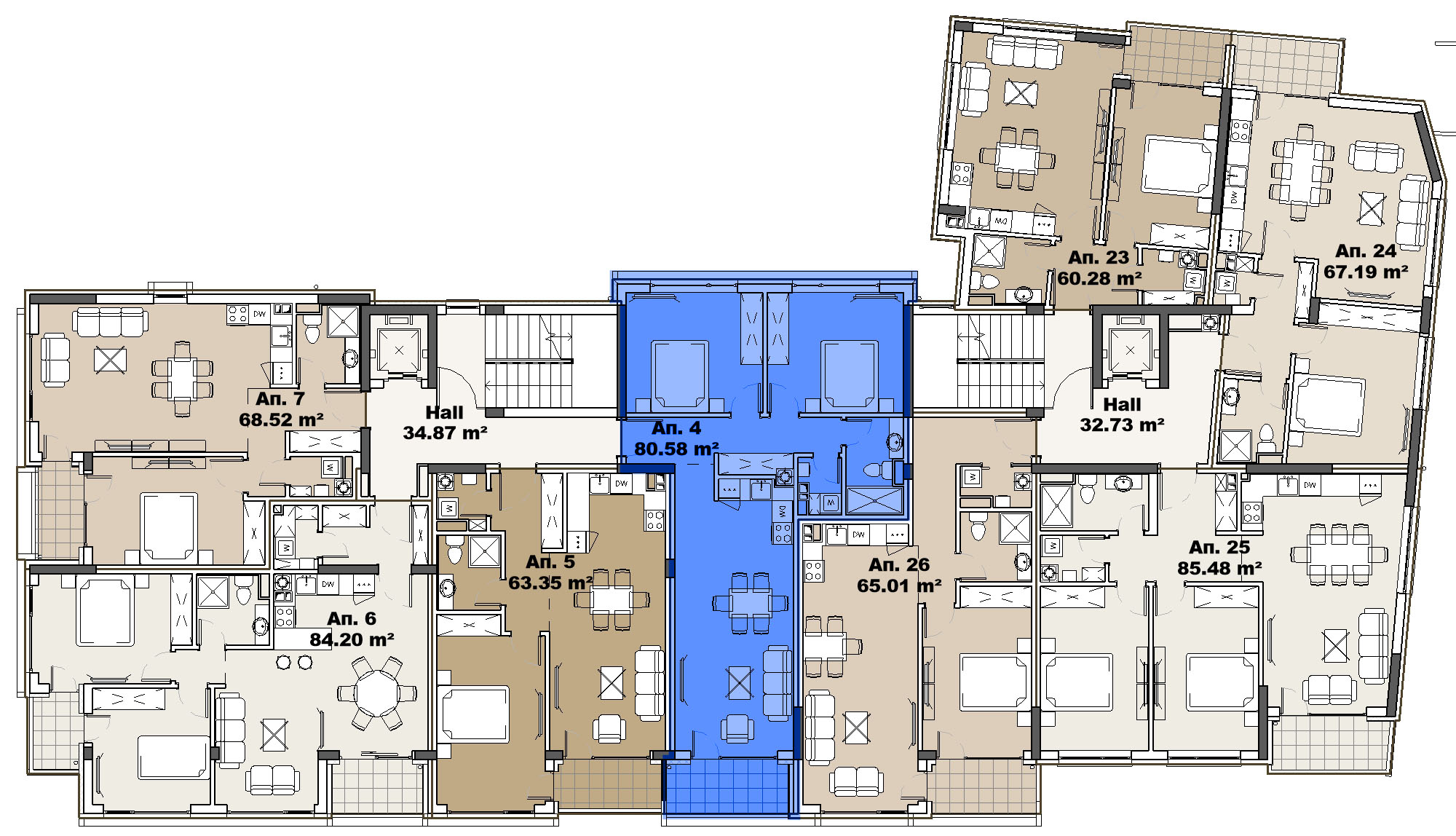 Апартамент с дневна и кухня, 2 спални, 1 баня, коридор, склад и тераса.