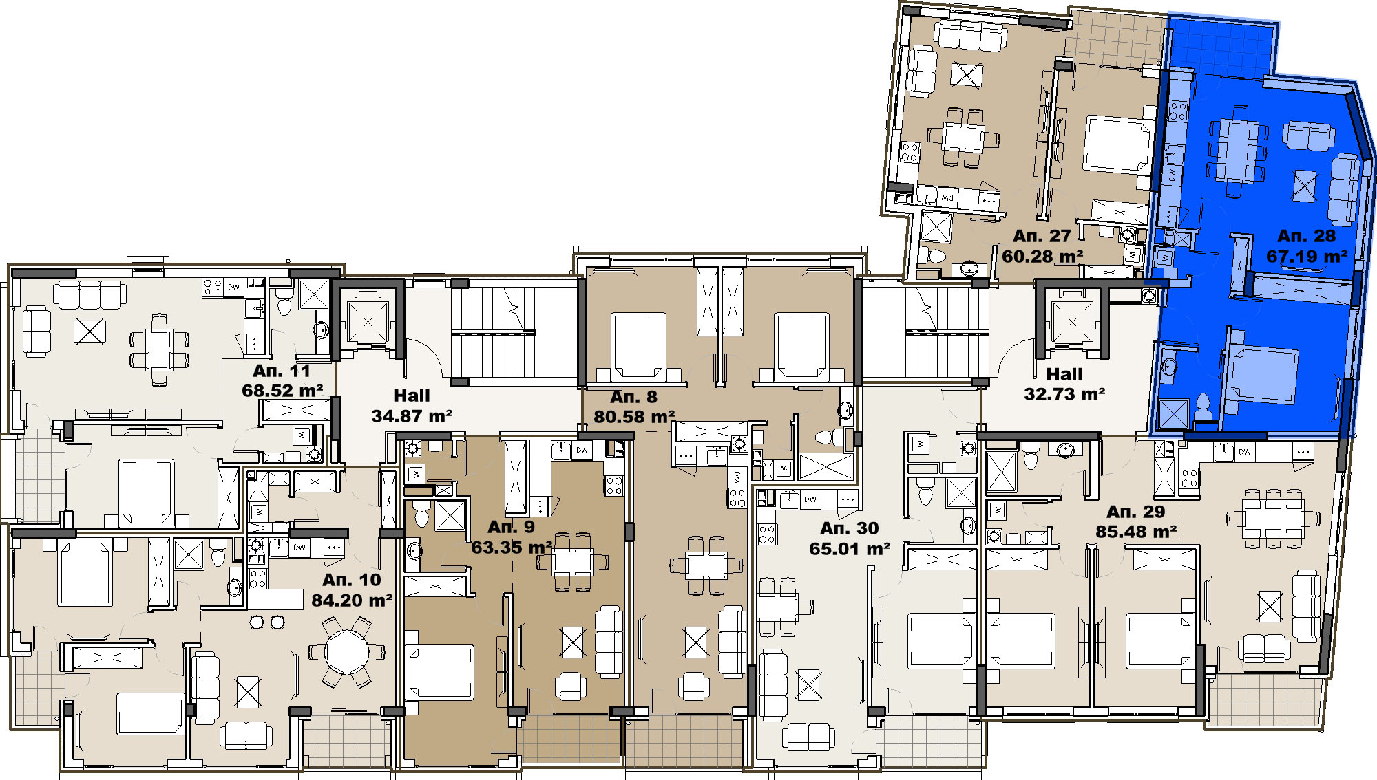 Апартамент с дневна и кухня, 1 спалня, 1 баня, коридор, склад и тераса.