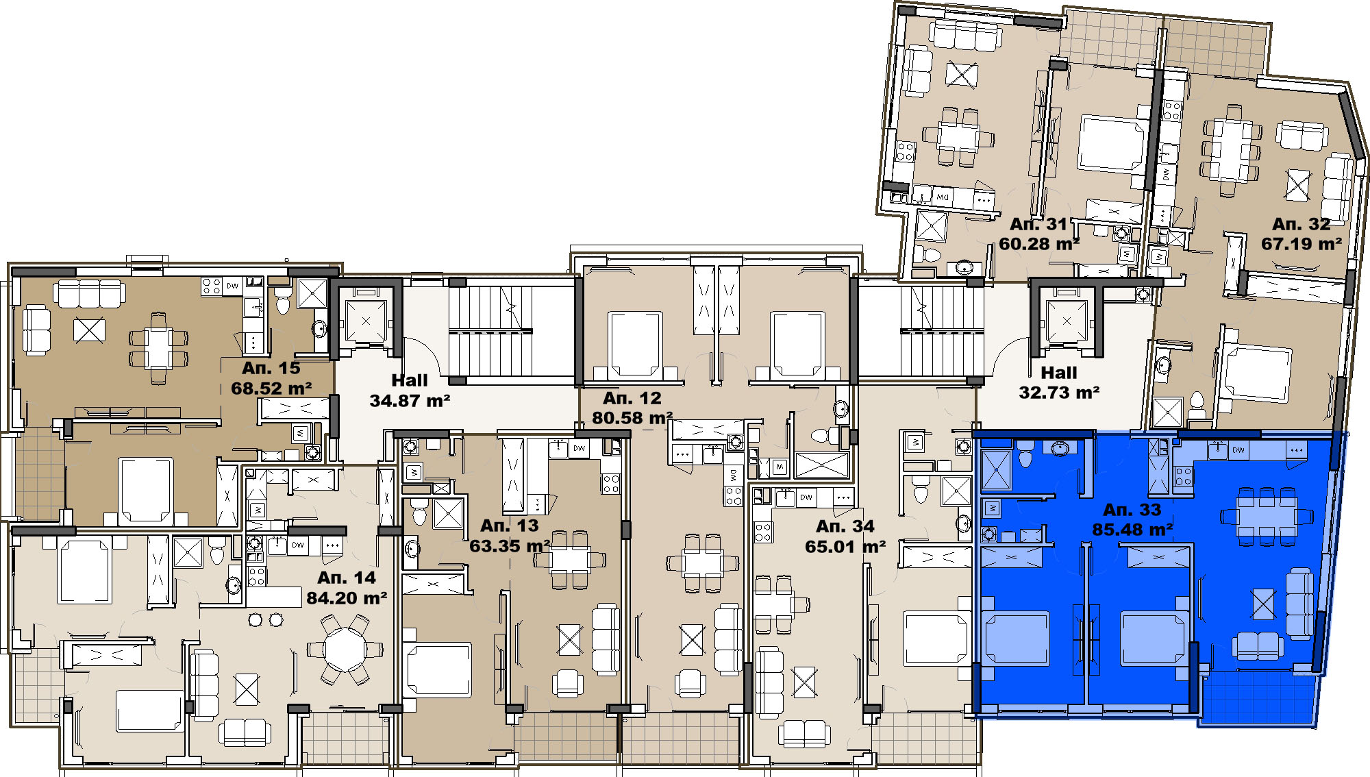 Апартамент с дневна и кухня, 2 спални, 1 баня, коридор, склад и тераса.