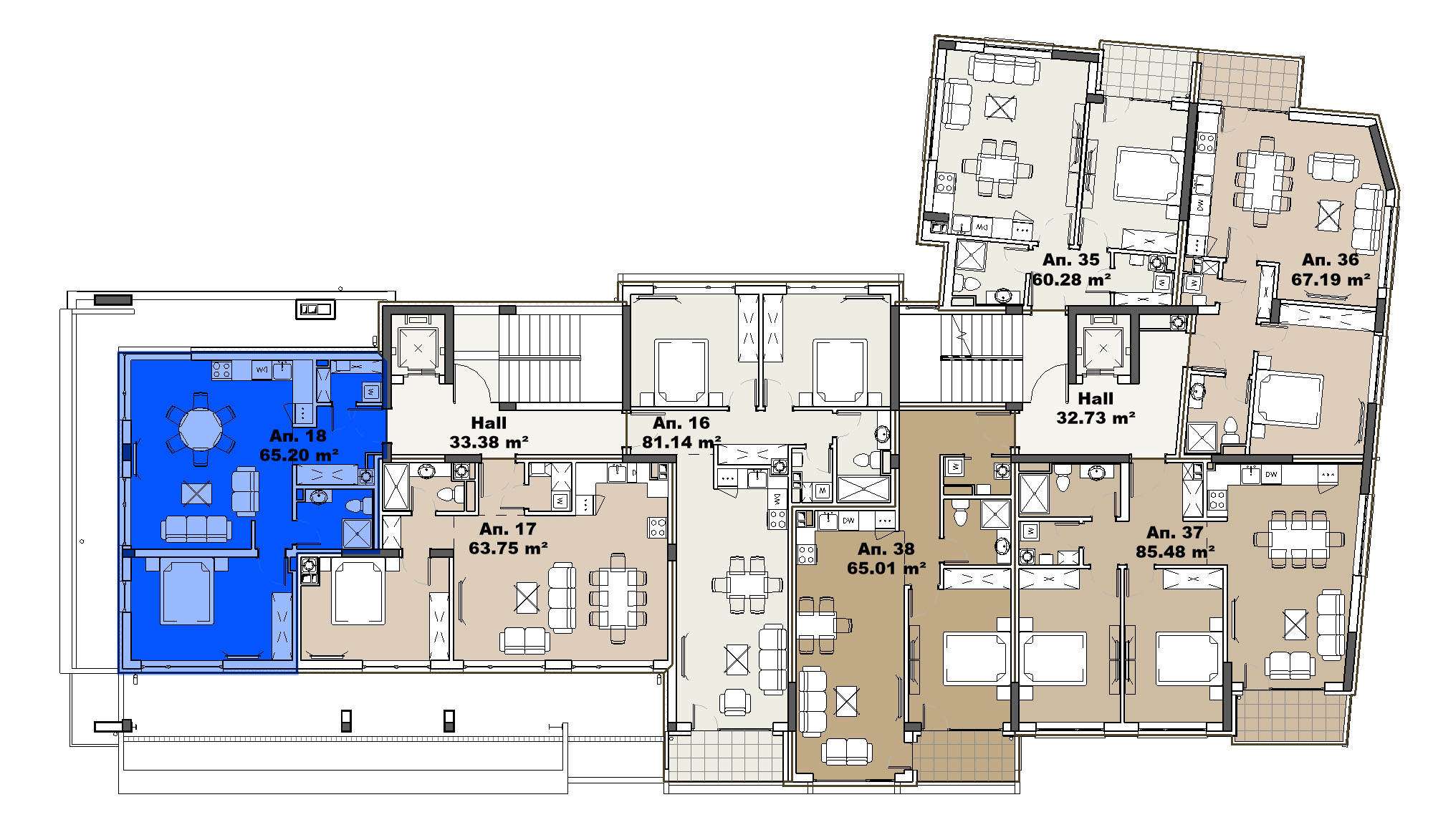 Апартамент с дневна и кухня, 1 спалня, 1 баня, коридор, склад и тераса.