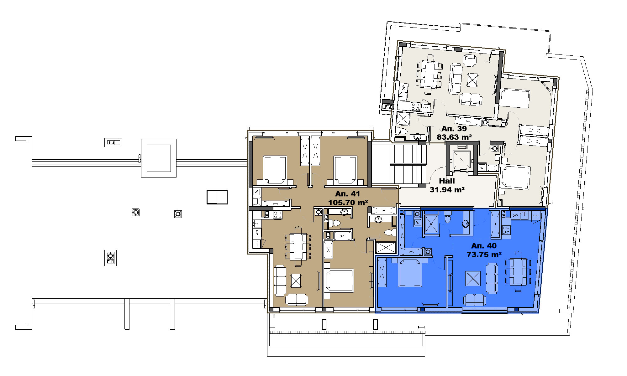 Апартамент с дневна и кухня, 1 спалня, 1 баня, коридор, склад и тераса.