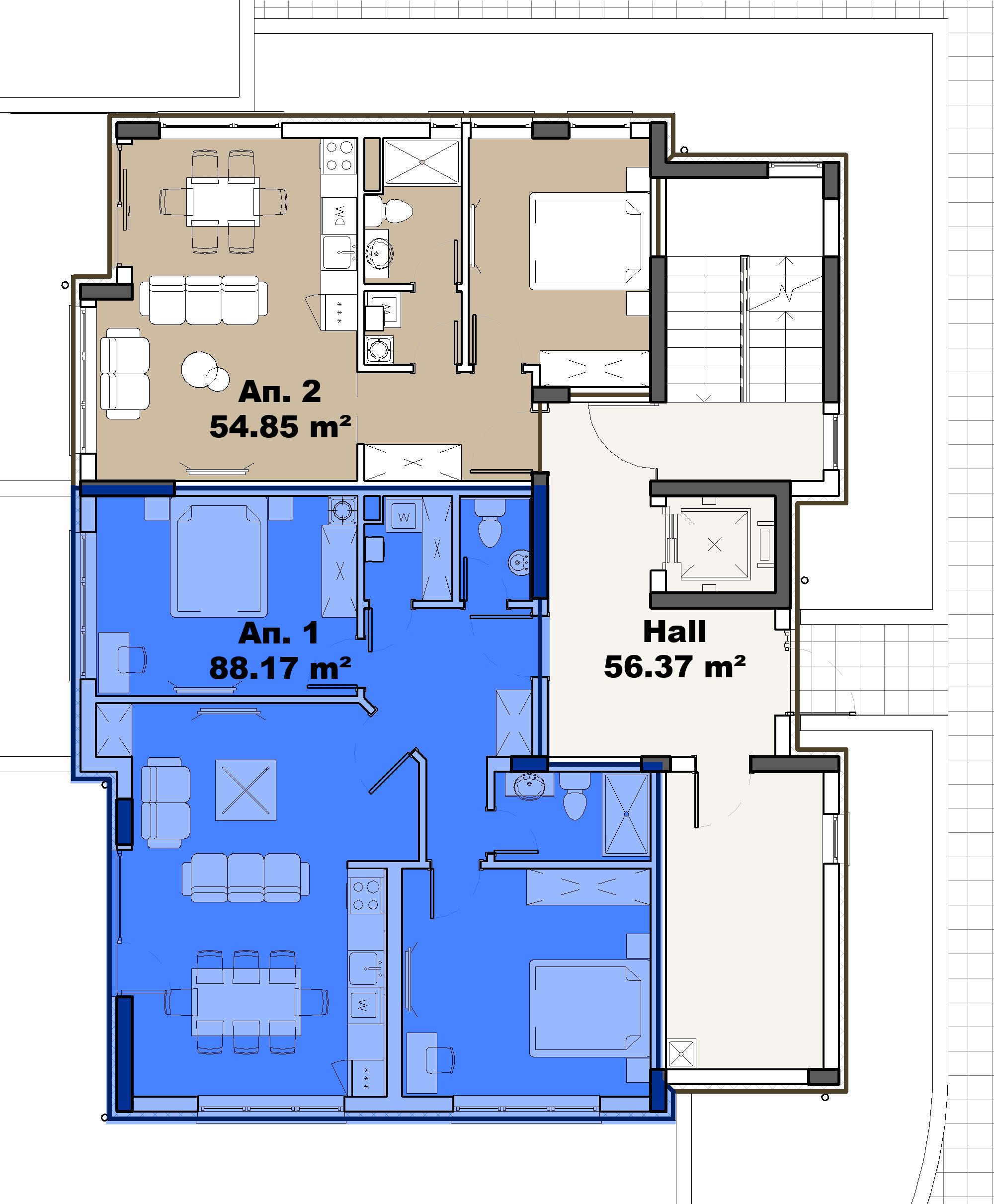 Апартамент с дневна и кухня, 2 спални, 2 бани, коридор, склад и тераса.