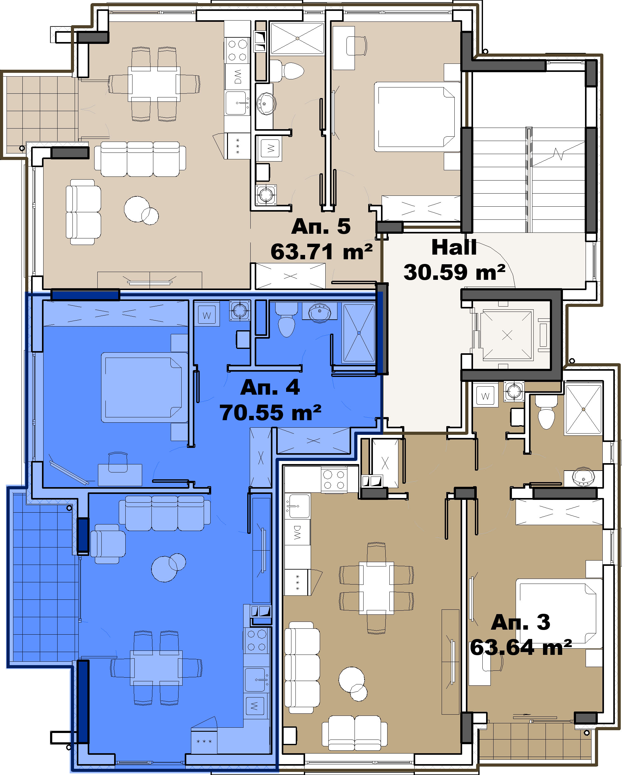 Апартамент с дневна и кухня, 1 спалня, 1 баня, коридор, склад и тераса.