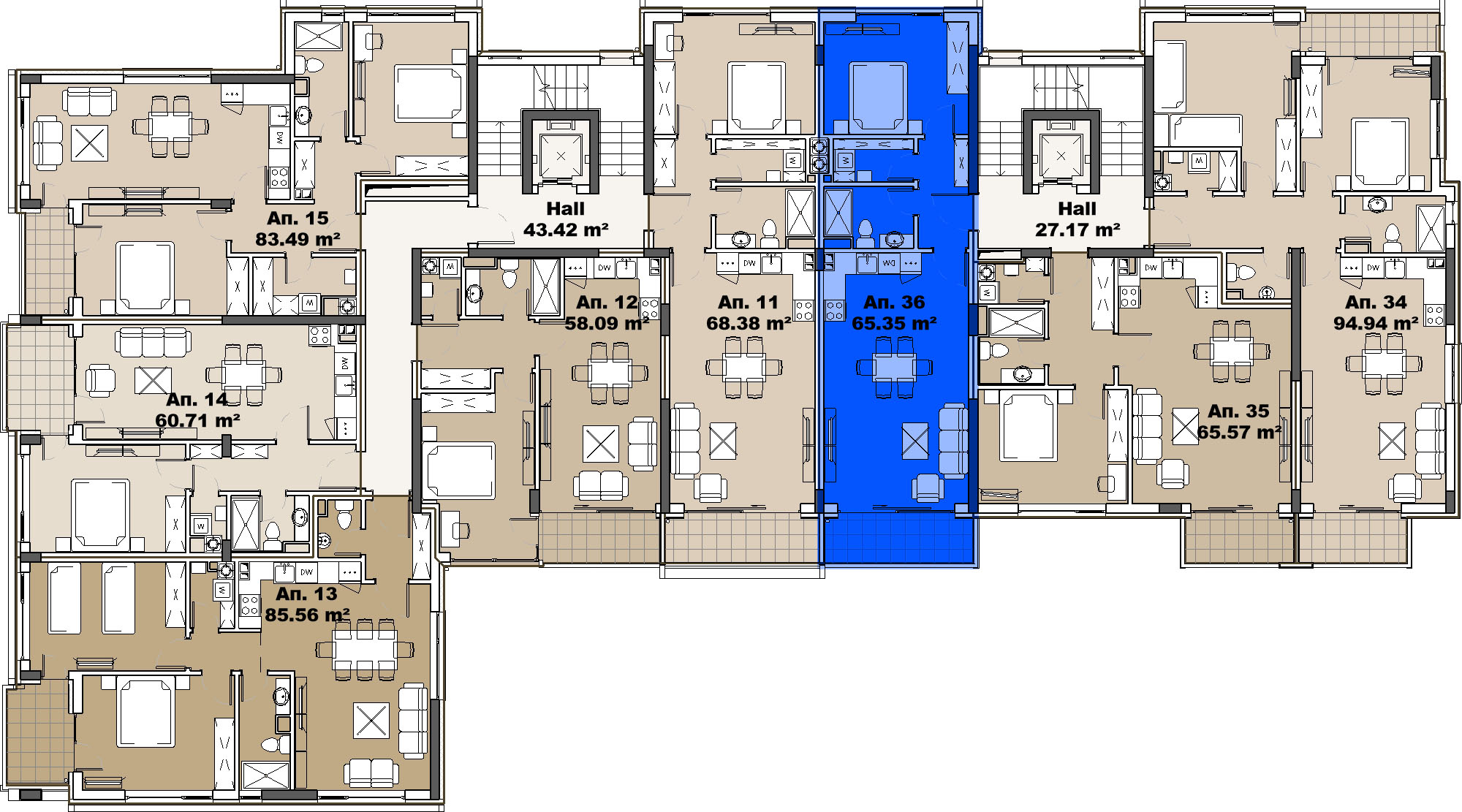 Апартамент с дневна и кухня, 1 спалня, 1 баня, коридор, склад и тераса.
