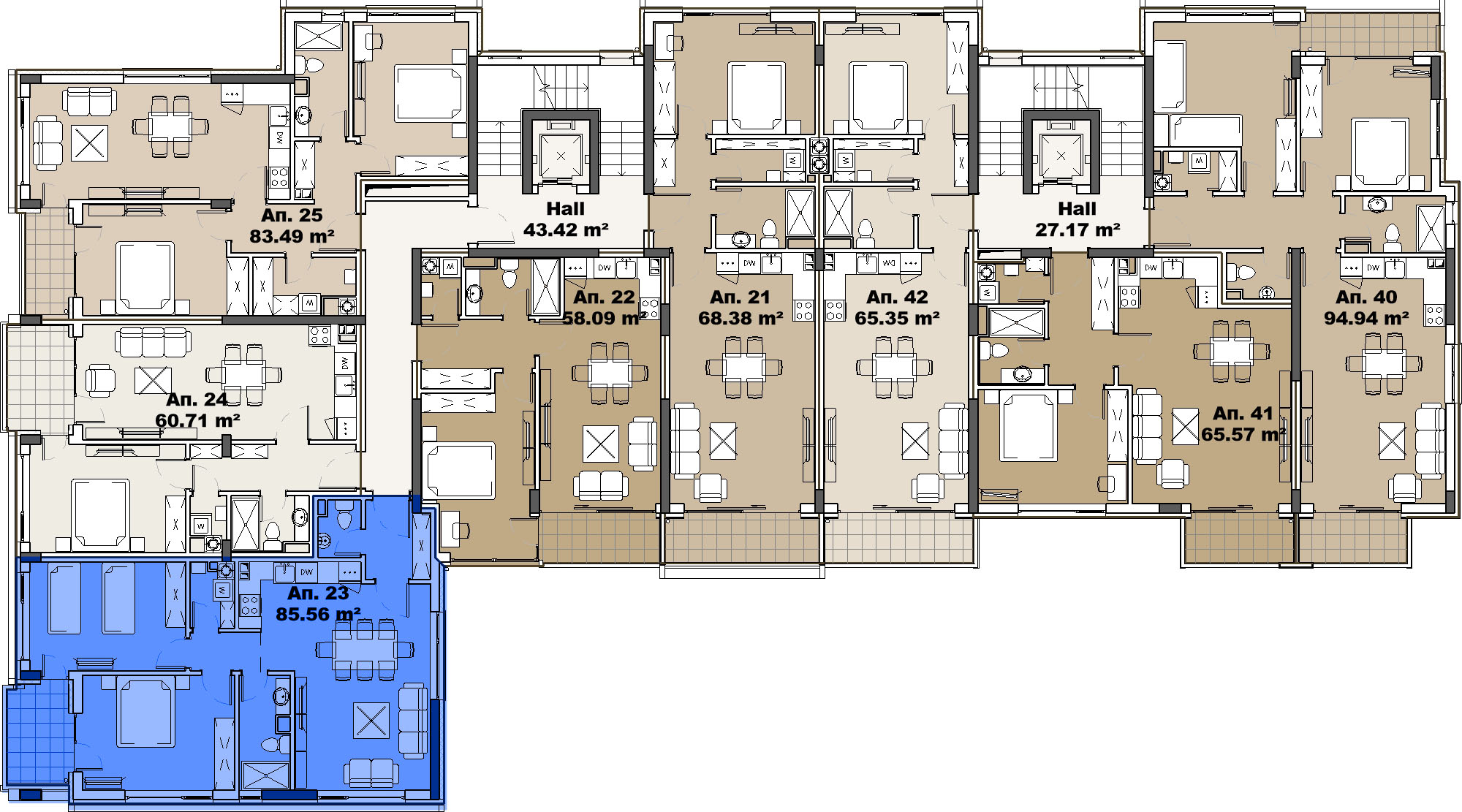 Апартамент с дневна и кухня, 2 спални, 2 бани, коридор, склад и тераса.